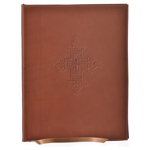 Okładka na rytuały obrzędy formatu A4 z koszulkami w brązowym kolorze i z krzyżem odciśniętym na gorąco (20 stron, 40 widocznych).