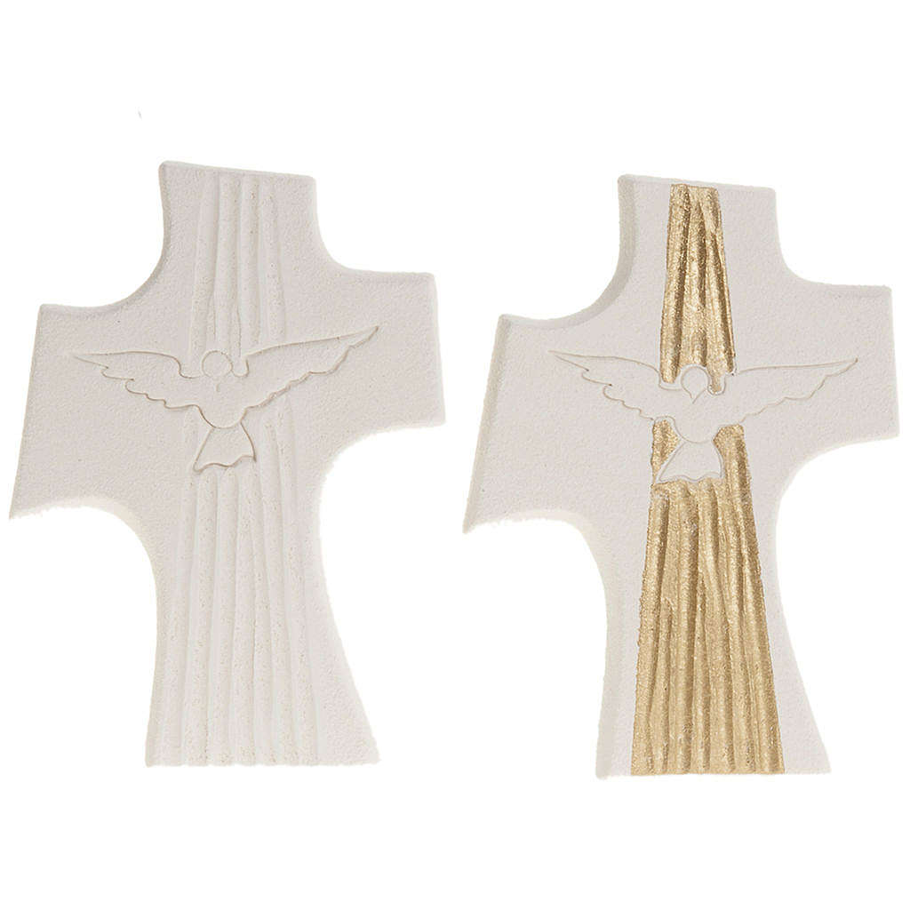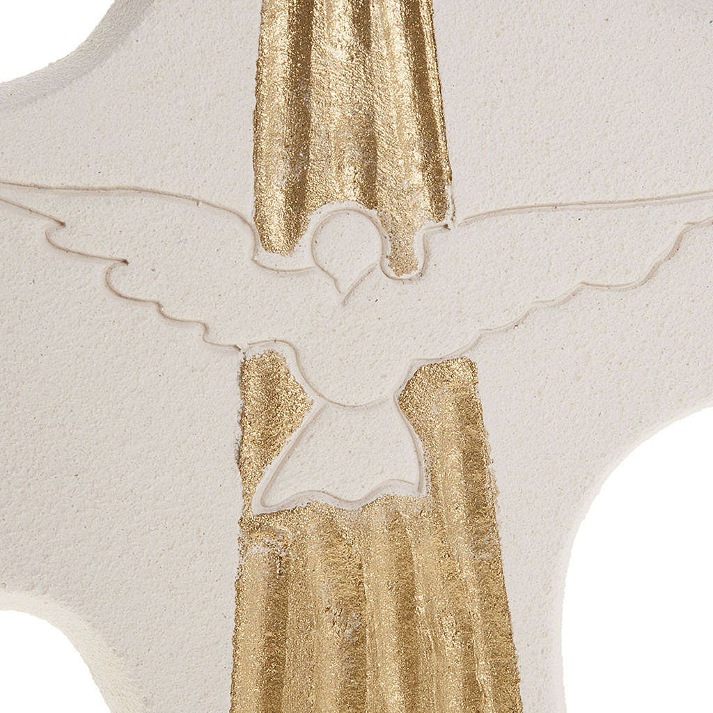 Krzyż ze stylizowanym wizerunkiem gołąbka w locie umieszczonym w centrum został wypalony w temperaturze ponad 1000°C. Obróbka i wykończenie zostało w całości ręcznie przeprowadzone tak, aby nadać dziełu przyjemnych, prostych i eleganckich linii.