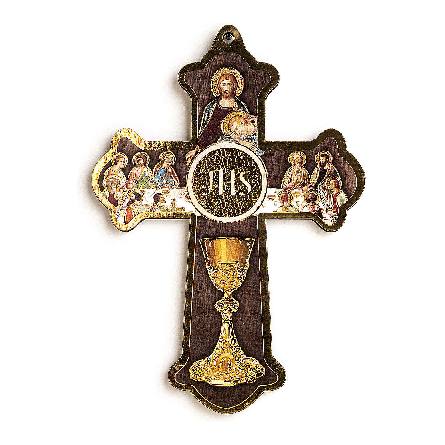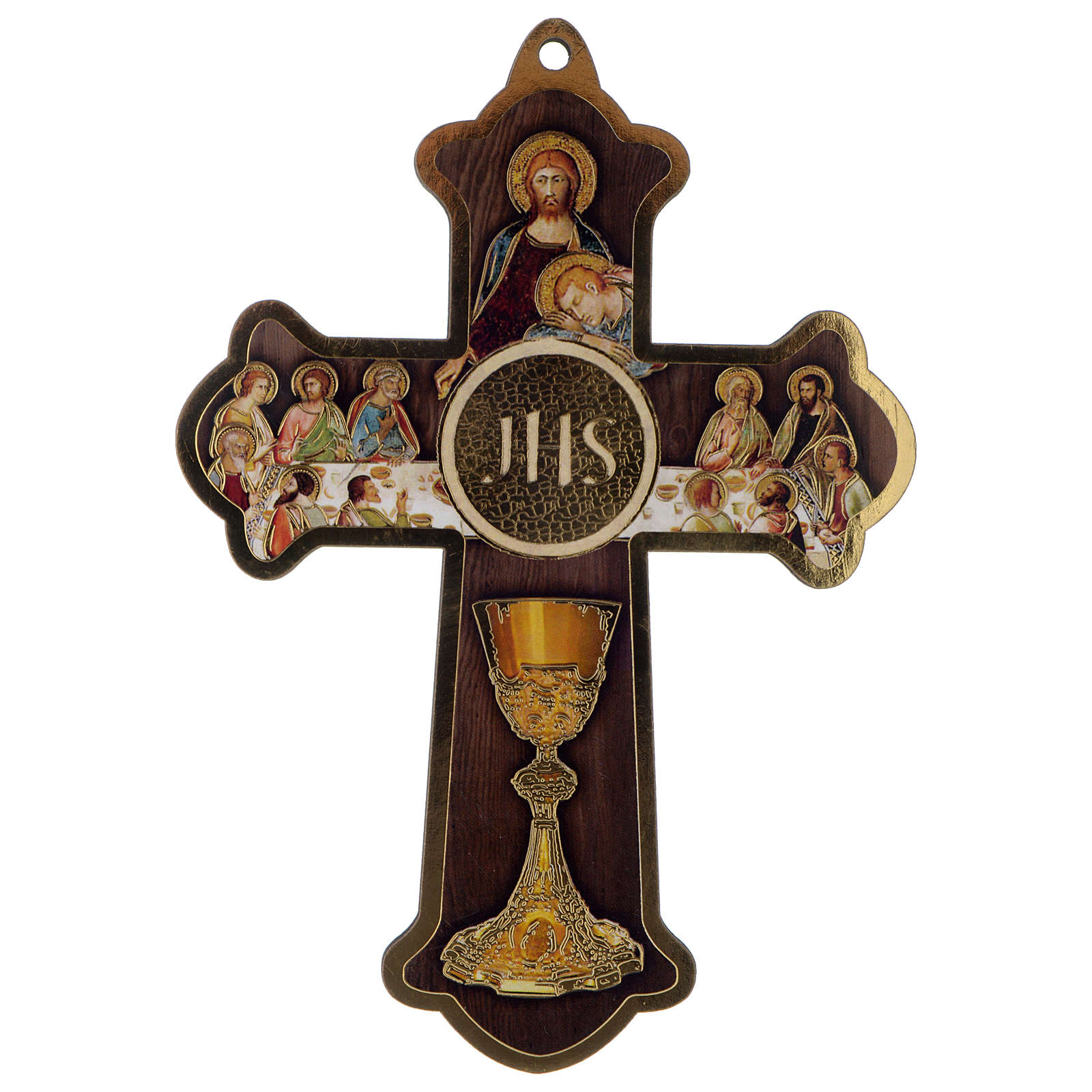 Krzyż Komunia nadruk na drewnie Kielich i Ostatnia Wieczerza.