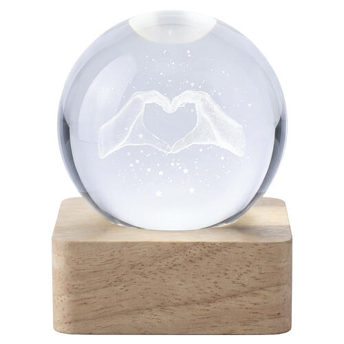 Kula z kryształu z dekoracją przedstawiającą dwie dłonie tworzące serce, elegancki, symboliczny przedmiot dekoracyjny na stół.