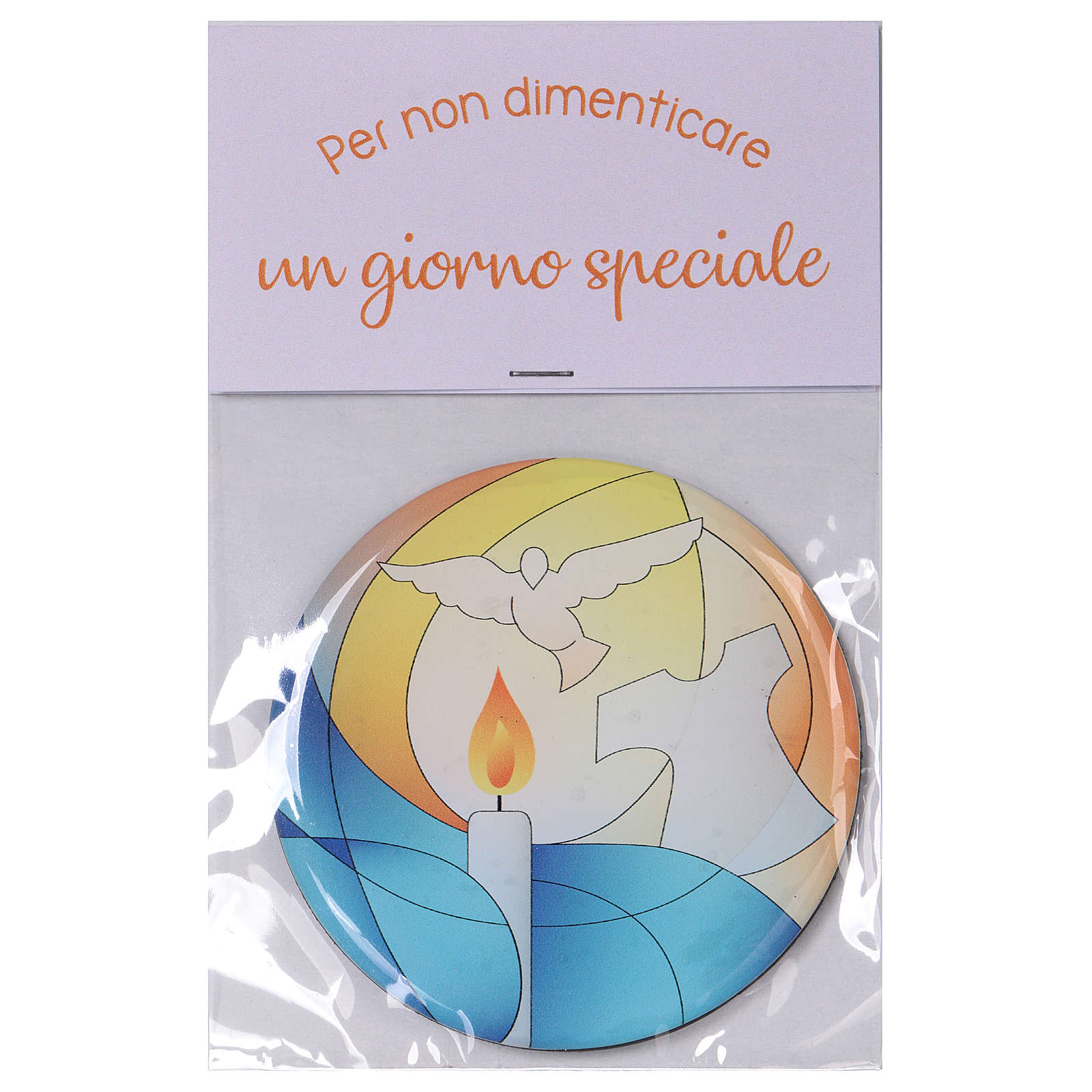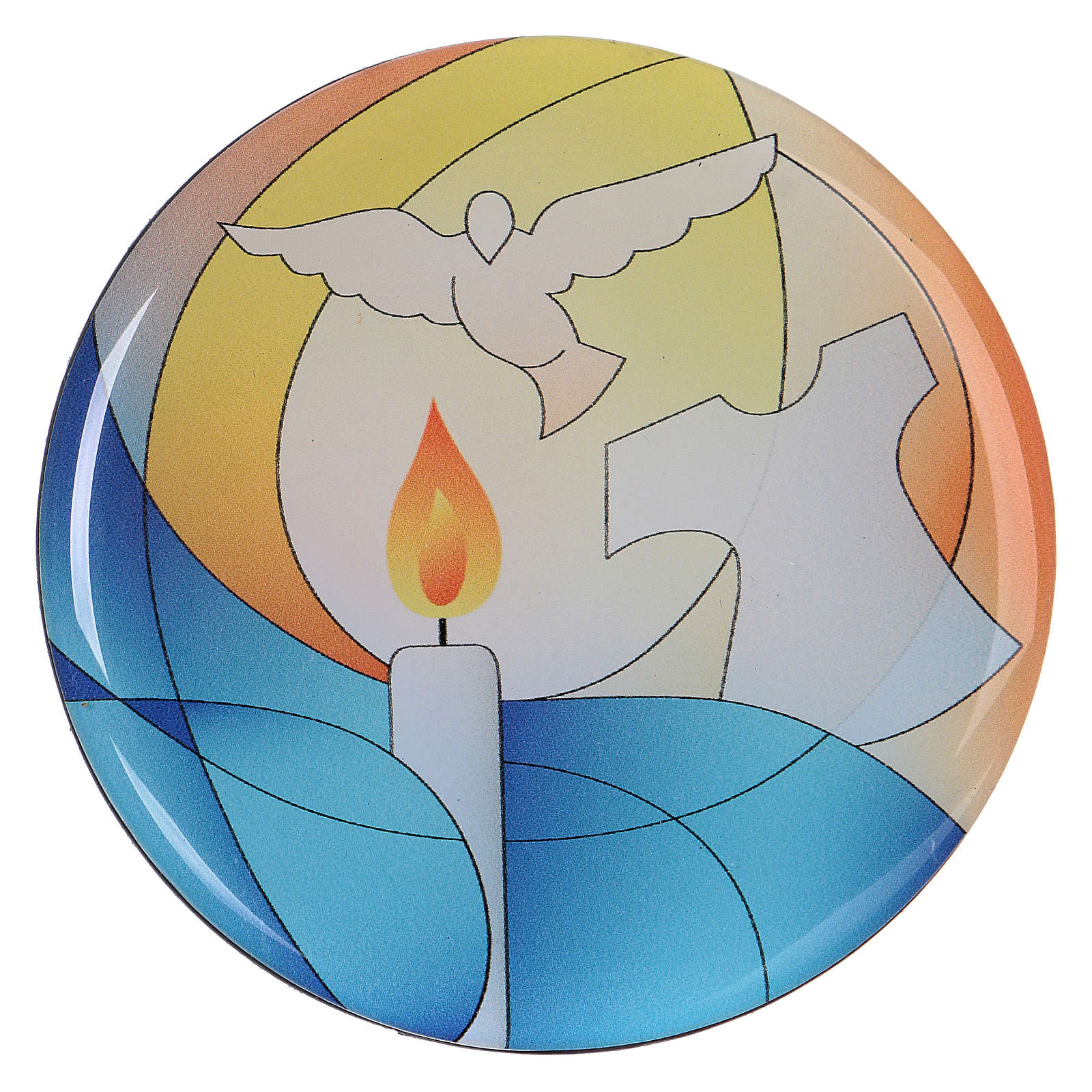 Magnes na Chrzest o średnicy 7 cm, zrealizowany przez Centro Ave w Loppiano (Włochy).