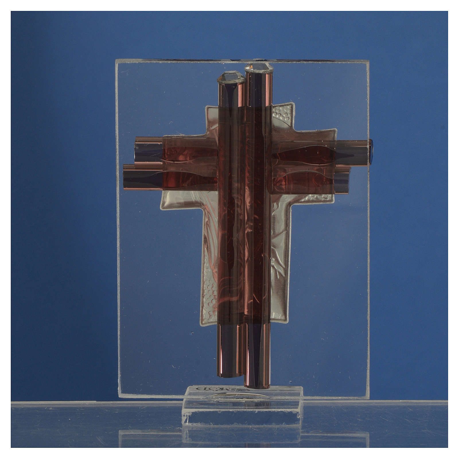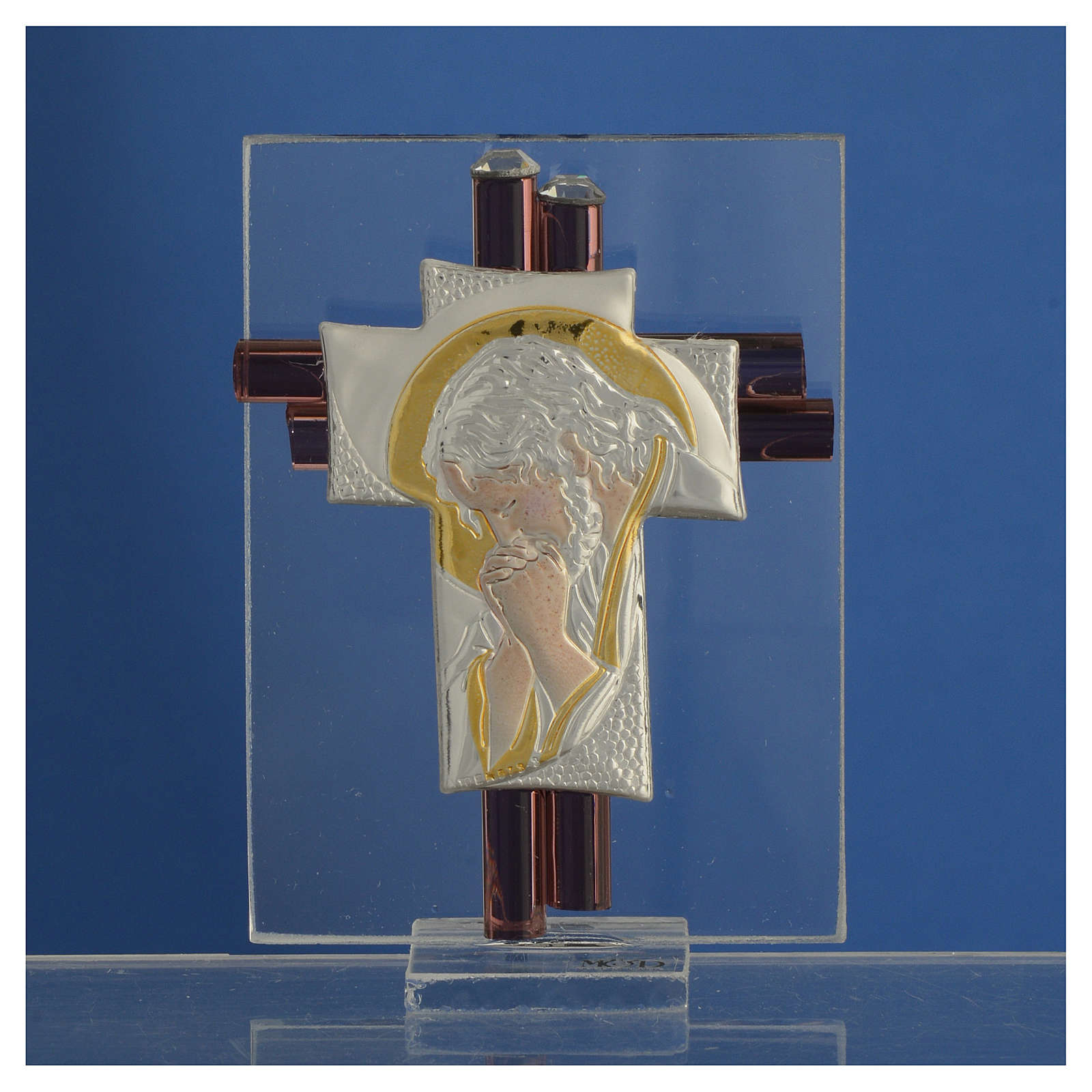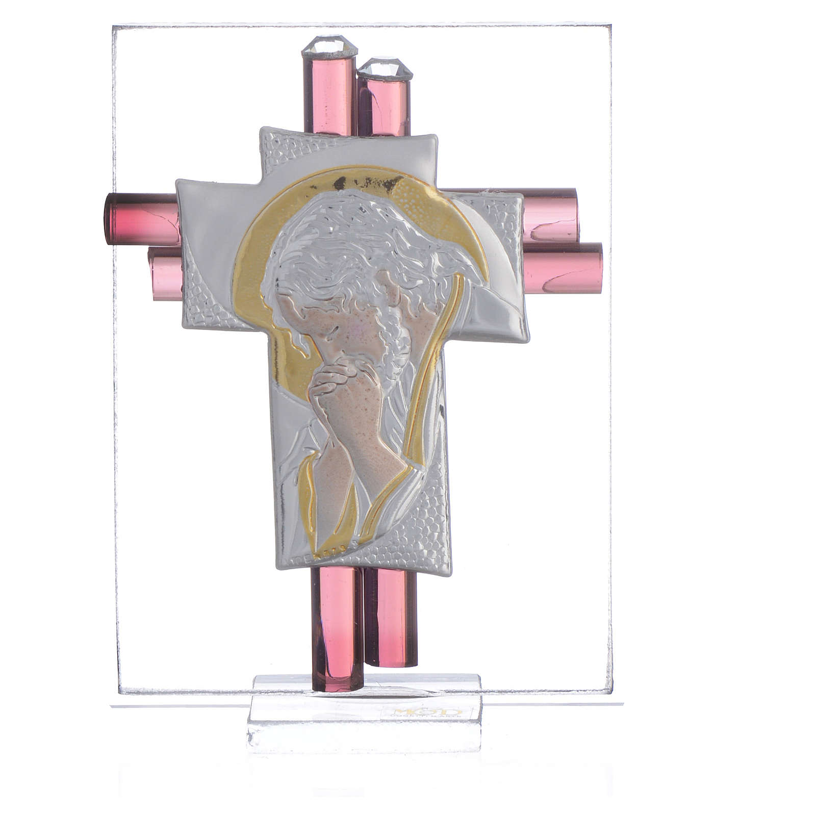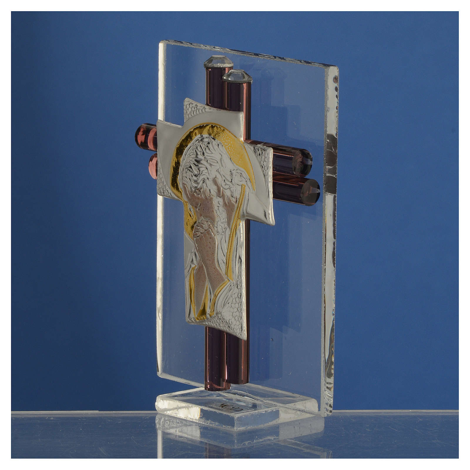 Pamiątka Krzyż Chrystus szkło Murano liliowe i srebrne 8cm