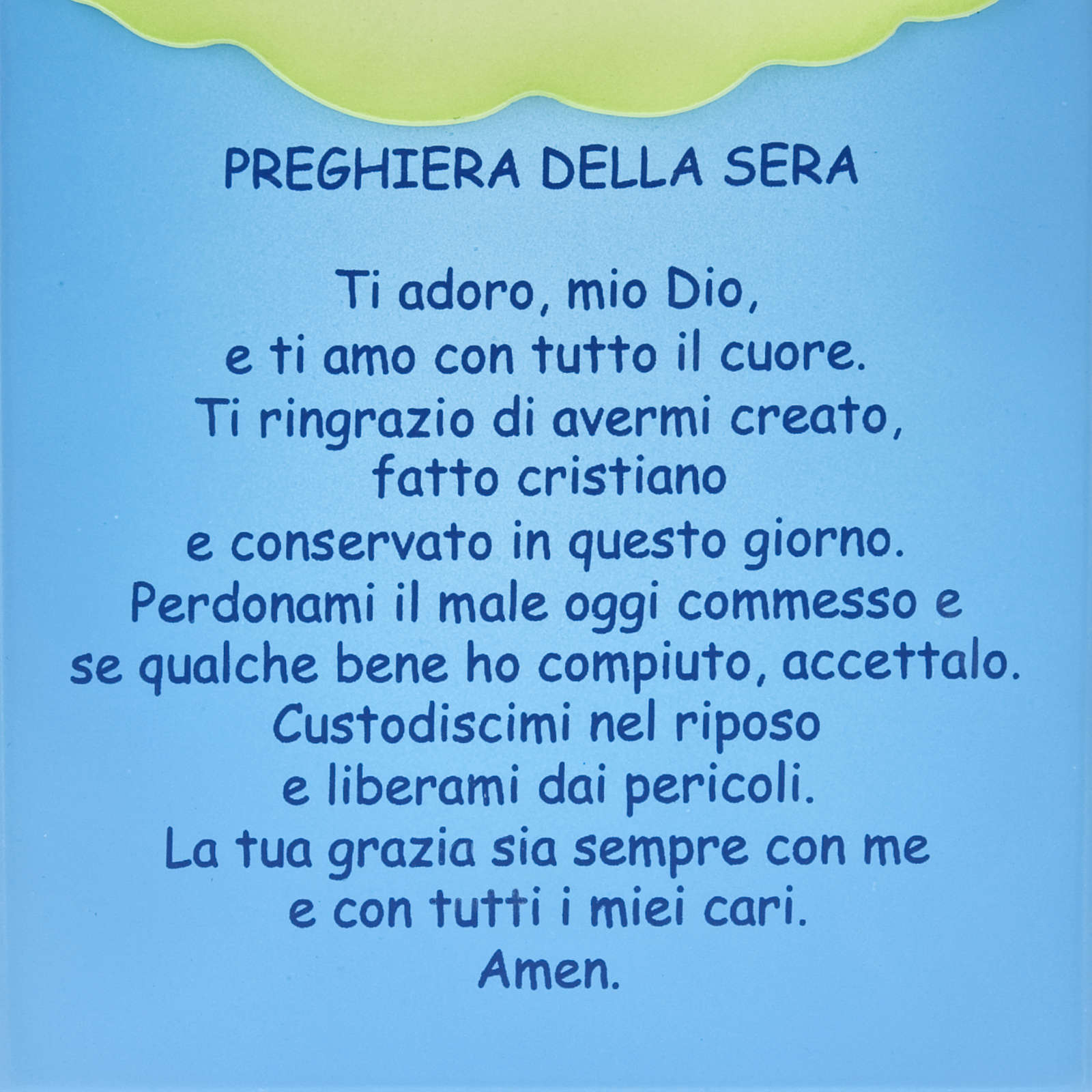 Płaskorzeźba przestawia dziecko pogrążone w modlitwie na granatowym, nocnym tle oraz posiada naniesioną modlitwę "Preghiera della Sera". Płaskorzeźba ta została wykonana z drewna i posiada otwór w tylnej części do zawieszenia na ścianie w dziecięcym pokoju lub do ozobienia innej części domu.