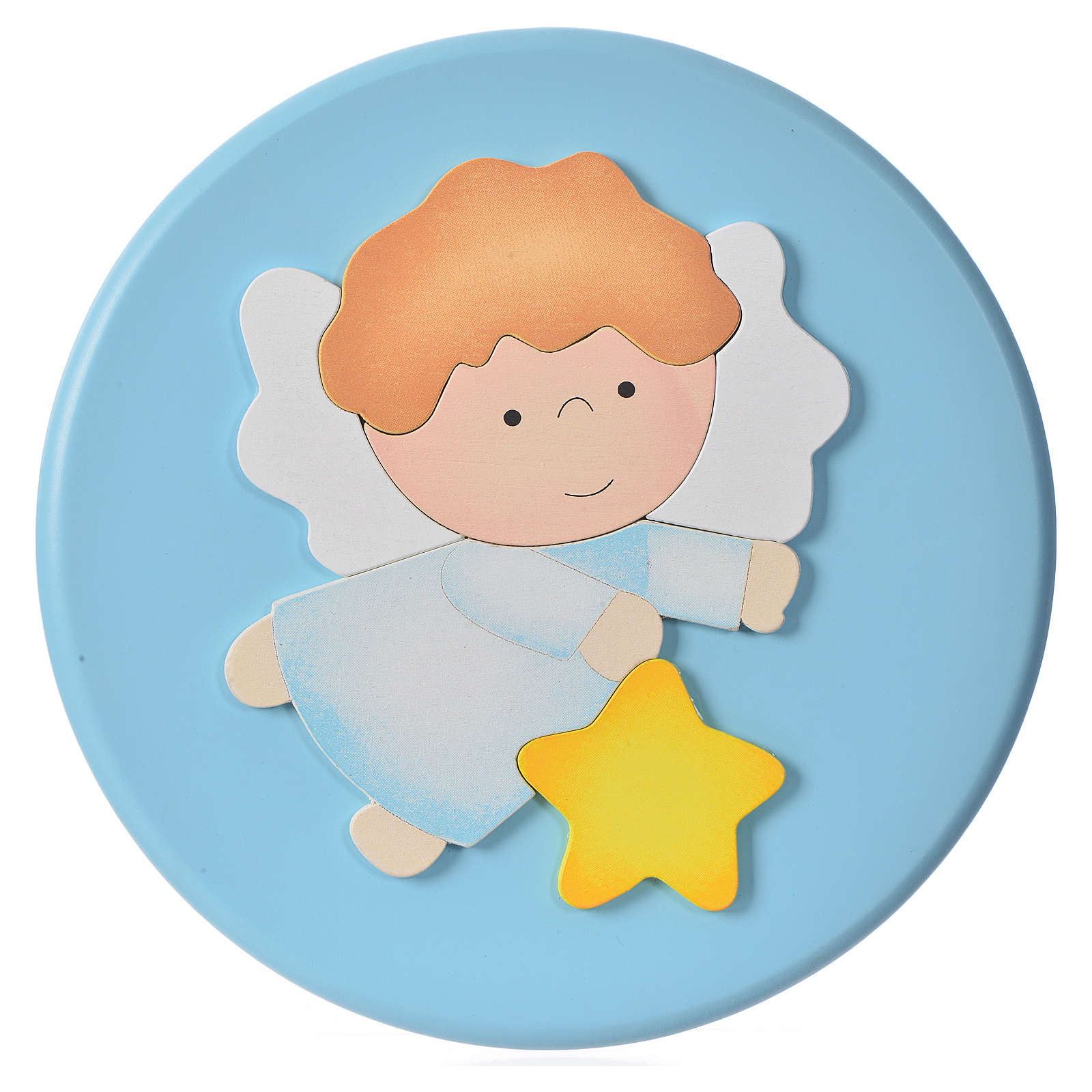 Obrazek z aniołem w kolorze różowym lub błękitnym. Płaskorzeźba zrealizowana z drewna, idealna do zawieszenia na ścianie w pokoju dziecinnym. Może być doskonałym pomysłem na prezent na chrzest, urodziny lub jakąkolwiek inną specjalną okazję.