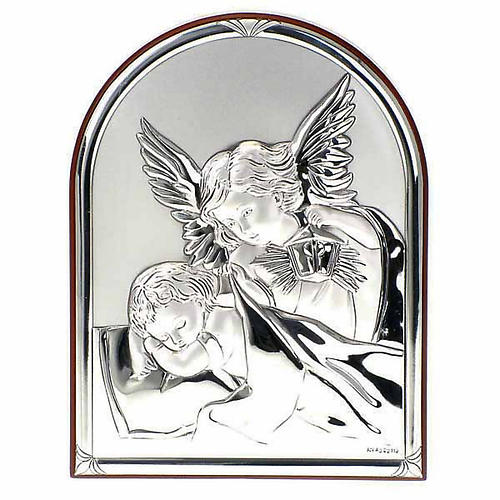 Anioł Stróż, owalna płaskorzeźba ze srebra o prostej podstawie.
