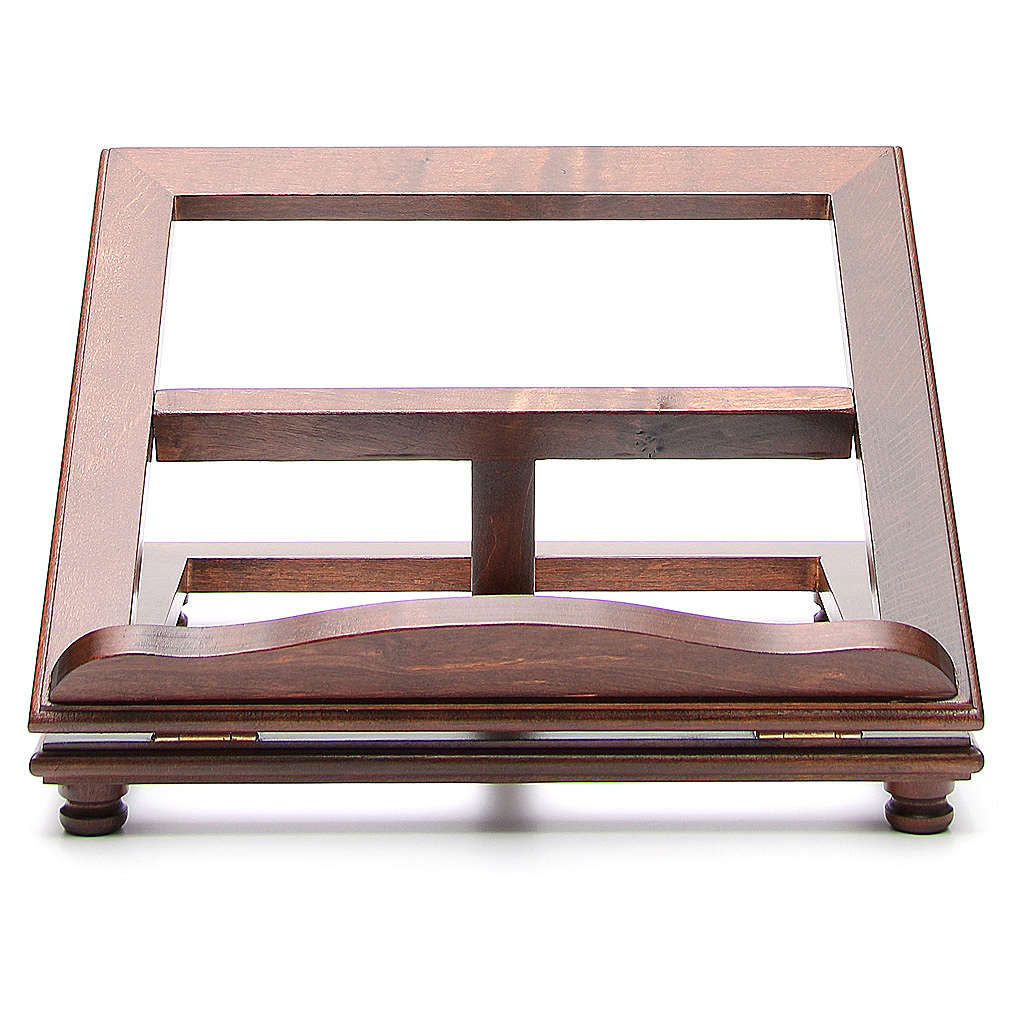 Pulpit z drewna kolor orzechowy, o bardzo prostych kształtach, ekonomiczny, podnoszony do trzech wysokości.