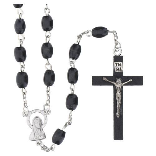 Różaniec wykonany z czarnych drewnianych paciorków o średnicy 6 mm, połączonych łańcuszkiem z centralnym medalionem i dopasowanym krzyżykiem.