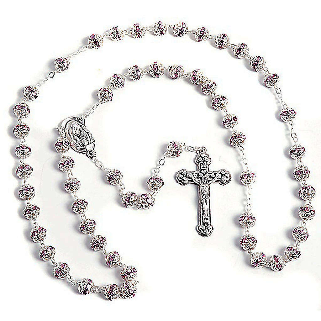 Różaniec z koralikami z metalu i z obwódką z różowym strasem.