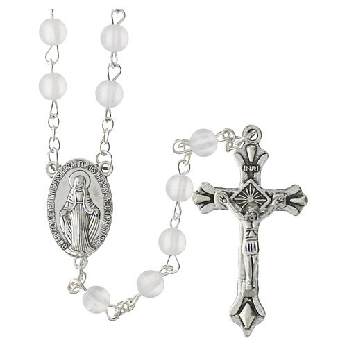 Różaniec z białymi, matowymi paciorkami o średnicy 6 mm wykonanymi z PCV o efekcie szkła, połączonymi łańcuszkiem metalowym.
