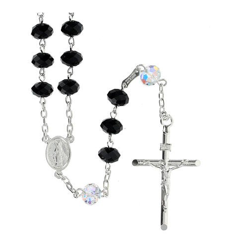 Różaniec o obwodzie 64 cm, z paciorkami "pater" o średnicy 8 mm wykonanymi z białego kryształu briolette oraz paciorkami "Ave Maria" 8 mm w czarnym krysztale briolette.