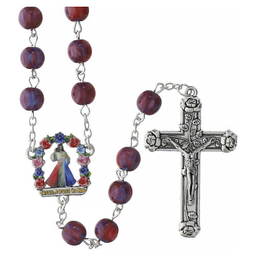 Różaniec „Boże Miłosierdzie” z czerwonymi, marmurkowymi koralikami z żywicy o średnicy 8 mm, osadzonymi w podwójnych oprawach ze szkła i metalu.