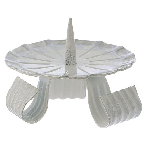 Podstawa pod świecę trójnożna z kolcem pośrodku, z żelaza, w białym kolorze.