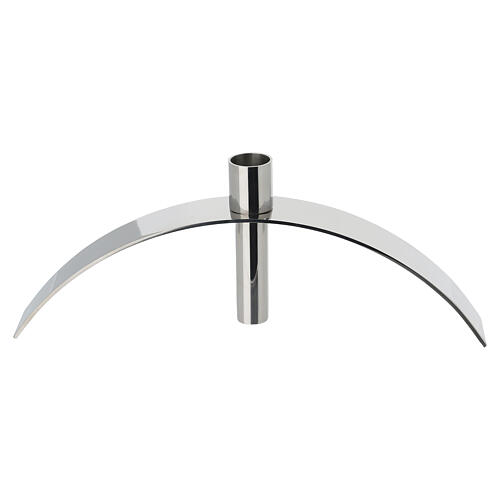 Metalowy świecznik o łukowej konstrukcji i zwartej, poziomej formie. Projekt obejmuje zaokrągloną podstawę z centralnym, cylindrycznym uchwytem; całość wykończona połyskującą, równomierną powłoką metaliczną.