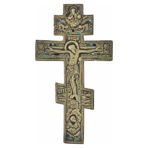 Autentyczny rosyjski krucyfiks ortodoksyjny z początku XIX wieku, wykonany z brązu z emaliowanymi detalami.