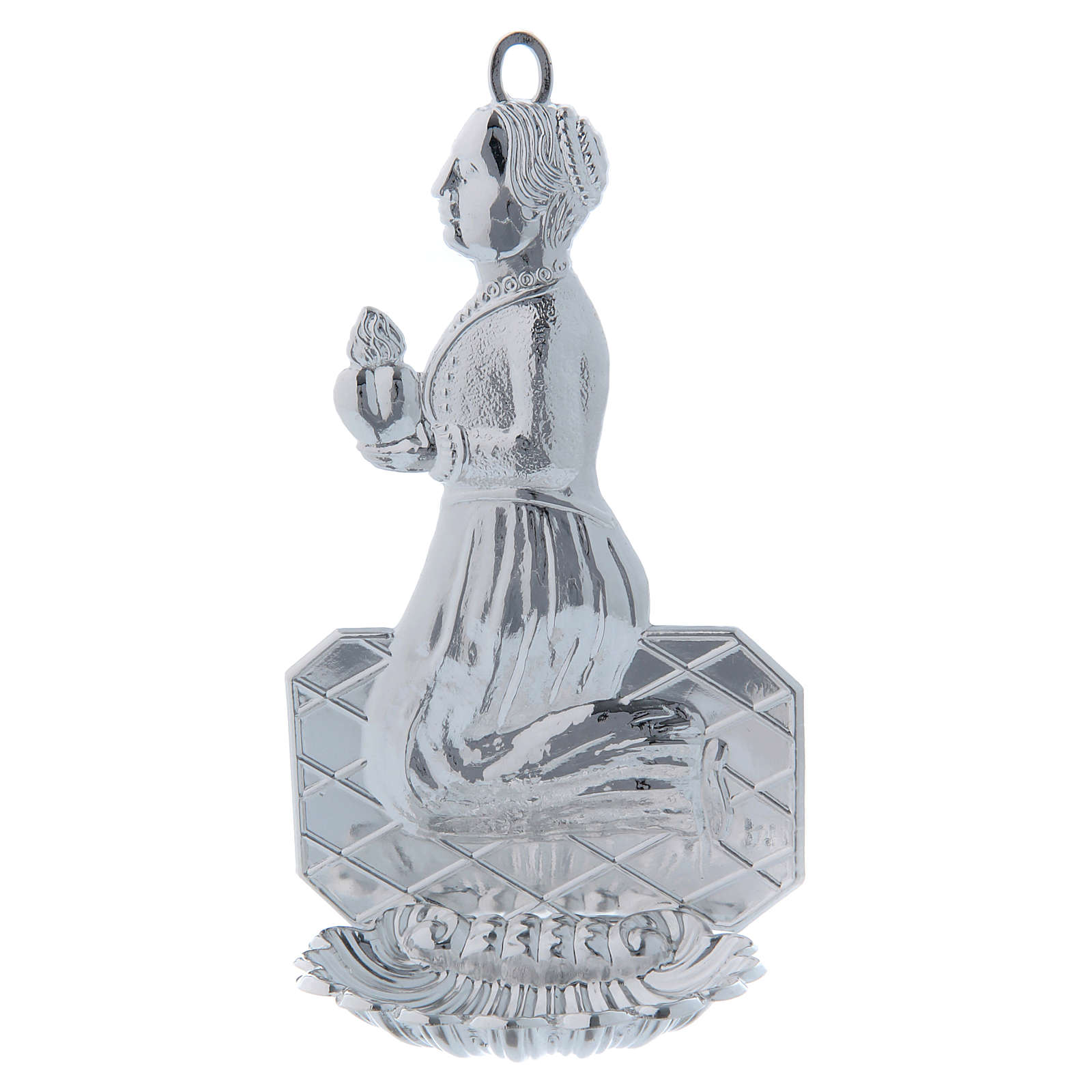 Wotum z metalu w formie kropielnicy z wizerunkiem modlącej się kobiety.