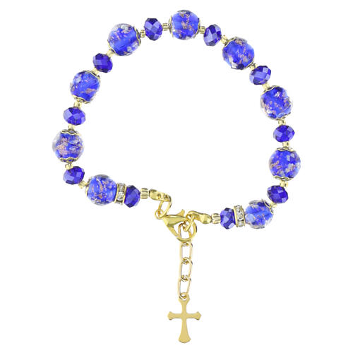Bransoletka ROSE w złoconym wykończeniu, wykonana z niebieskich pereł ze szkła Murano o średnicy 10 mm, przeplatanych fasetowanymi kryształami Bohemia 5 mm.