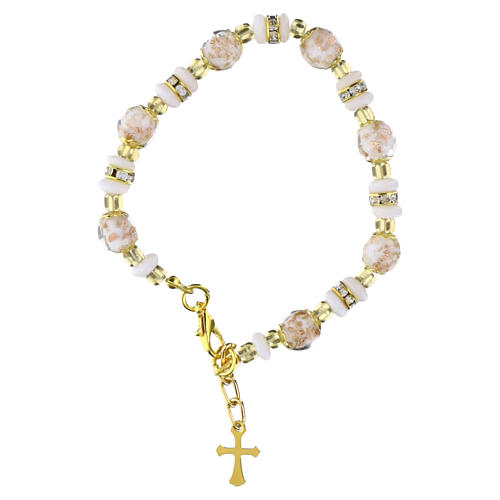 Wzór naprzemienny: kuleczki ze szkła Murano przeplatają się z połyskującymi perłami slaviche; z boku, obok środka, umieszczony jest subtelny złoty krzyżyk.
