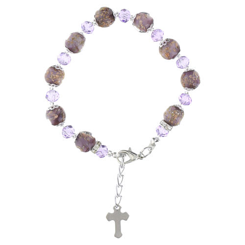 Bransoletka z pereł ze szkła Murano, liliowa, kryształy 5 mm, wykończenie srebrne.