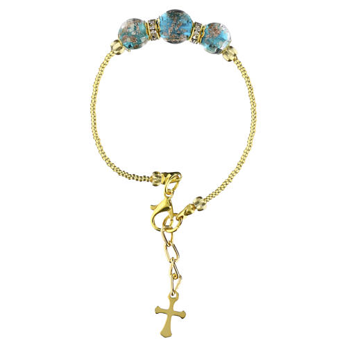Model zbudowany jest z kulistych koralików ze szkła Murano (Ø 10 mm) nawleczonych na łańcuszek z metalu z wykończeniem w kolorze złota; długość regulowana od 16 do 20 cm.