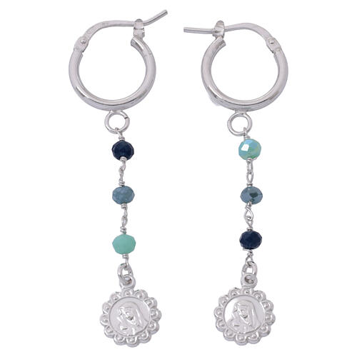Kolczyki Madonna z Dzieciątkiem, niebieskie kryształki, srebro 925 rodowane .