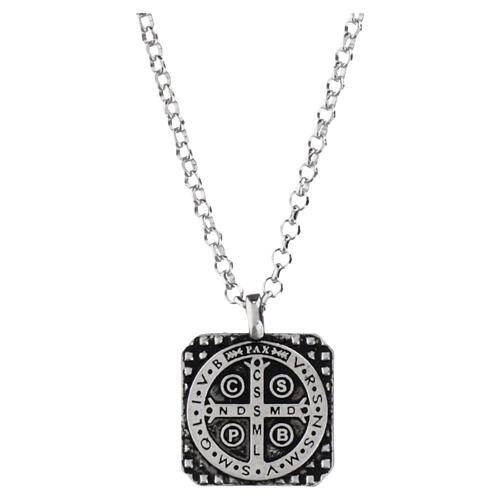 Medalik św. Benedykta w formie kwadratowej zawieszki, wykonany ze srebra 925 w oksydowanym wykończeniu.