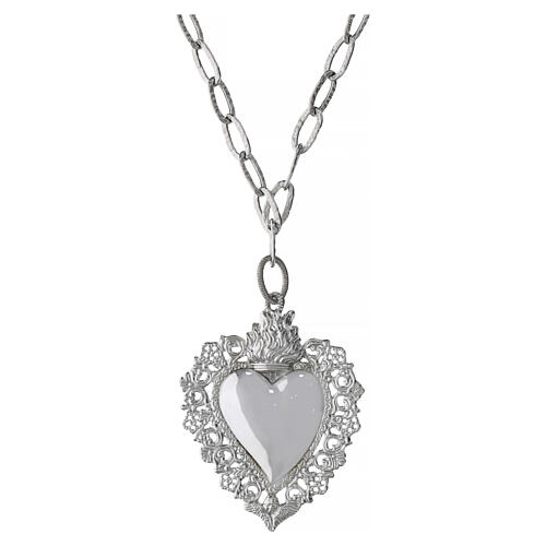 Duży wisiorek w kształcie Najświętszego Serca, osadzony w bogatej oprawie, zawieszono na łańcuszku z ogniw młotkowanych.