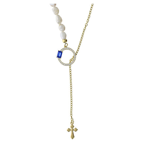 Model z wisiorkiem w formie krzyża opiera się na nici nieregularnych pereł naturalnych i posiada centralny krążek wysadzany białymi cyrkoniami oraz pojedynczy niebieski cyrkon szlifowany baguette (5 mm).