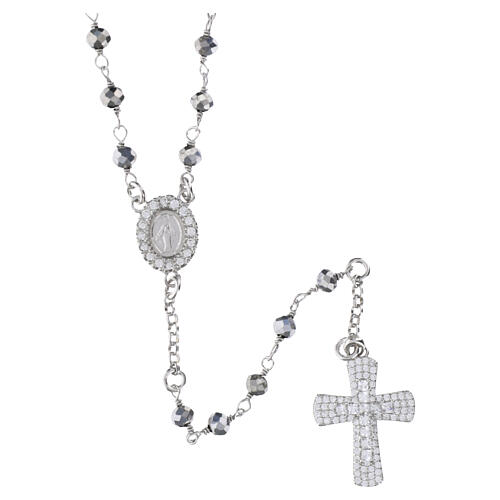 Różaniec biżuteryjny z hematytu i białych cyrkonii, Benedictus, srebro 925.