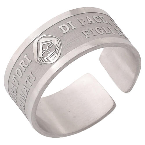Ten pierścionek ze srebra 925 Made in Italy ma wykończenie w kolorze srebrnym, kształt obręczy i jest dostępny w dwóch rozmiarach: 18 i 21 mm średnicy, z możliwością poszerzenia dzięki otwartej strukturze na tylnej części. Pośrodku pierścionka są widoczne są słowa zaczerpnięte z Kazania na Górze, przedstawiające błogosławieństwa, a dokładniej 'Błogosławieni, którzy wprowadzają pokój, albowiem oni będą nazwani synami Bożymi'.