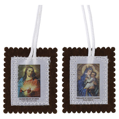 Brązowy szkaplerz z wizerunkami Matki Bożej z Góry Karmel i Najświętszego Serca.
