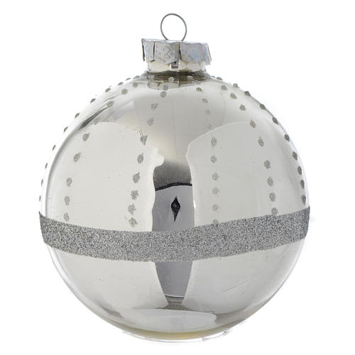 Bombka na choinkę wykonana ze szkła koloru srebrnego z brokatem, 90mm (wzory mieszane).
