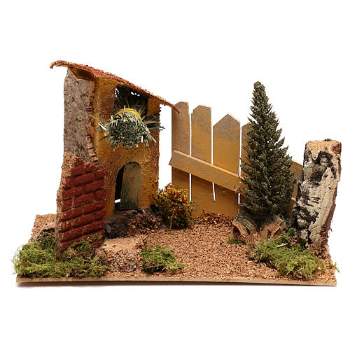 Domek z cyprysem, odpowiedni do szopki o wysokości referencyjnej 6 cm.