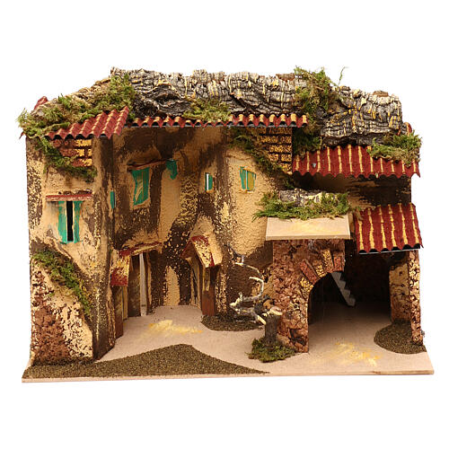 Scenografia z 3 domkami z osobnymi wejściami osadzonymi w korku przypominającym góry, z małą stajnią i nadstawą boczną.