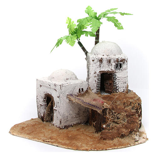Dom dwupoziomowy z kopułą w arabskim stylu i ganek, 35x35x30 cm, z drewna i żywicy.