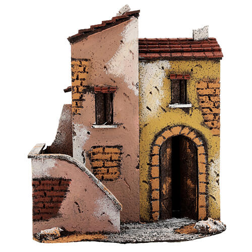 Para domków odpowiednich dla figurek do neapolitańskiej szopki o wysokości 8-10 cm, ozdobionych detalami takimi jak kominy, daszki, okienka i schodki.