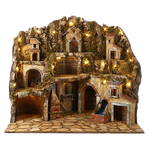 Klasyczna szopka neapolitańska 12-14 cm z młynem, wodospadem, światła, 75x82x60 cm
