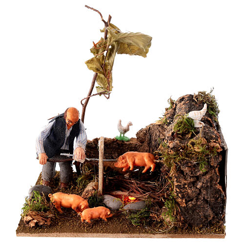 Mężczyzna przyrządza pieczone świnie, w ruchomej scenie szopki neapolitańskiej 8 cm.