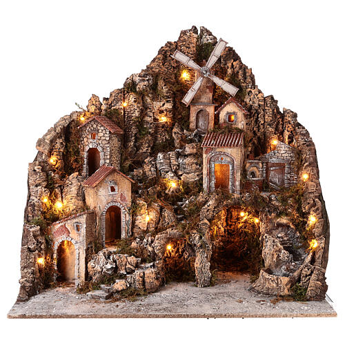 Młyn, znajdujący się w tej szopce, ma silnik obracający łopaty, symulujący obecność wiatru.