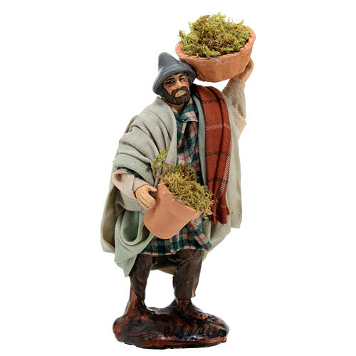 Figurka z terakoty prezentująca pasterza stojącego z koszem prawdziwego mchu w jednej ręce, a drugim koszem opartym na ramieniu. Ręcznie wykonana z terakoty, pomalowana i odziana w tkaninę przez neapolitańskich rzemieślników.