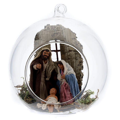 Rzeźba Sceny Narodzin o wysokości 10 cm z terakoty umieszczona w szklanej kuli nadaje się zarówno do zawieszenia na choince, jak i jako ozdoba stołu.