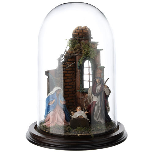 Szopka Bożonarodzeniowa umieszczona na podwyższonej, okrągłej podstawie o średnicy 25 cm, pokryta szklaną kopułą.
