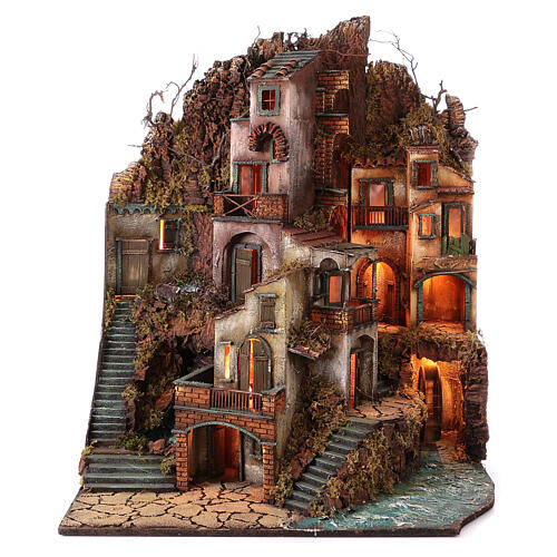 Scenografia do szopki z oświetleniem, młynem, wodospadem i jeziorem. Charakterystyczna dla szopek neapolitańskich, wioska rozciąga się na kilku poziomach.