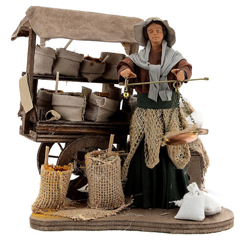 Stoisko na rynku obfitujące w worki pełne nasion z ruchomą sprzedawczynią, idealne do neapolitańskiej szopki o wysokości 14 cm.