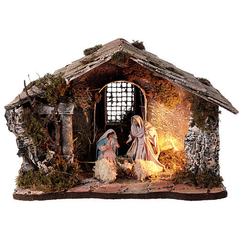 Stajenka bożonarodzeniowa z dachem spadzistym, figurki 12cm, szopka neapolitańska, 30x30x40 cm