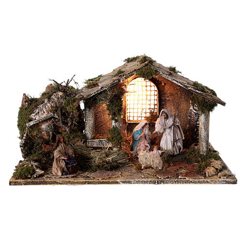 Ta szopka o wymiarach 30x47x26 cm została wykonana przez rzemieślników neapolitańskich, którzy pracują i tworzą ją ręcznie z tradycyjnych materiałów jak korek, drewno, mech i gałązki.