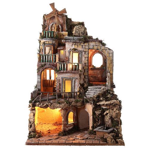 W tle znajduje się łuk po lewej i ruina z kolorowymi balkonami po prawej, a na najwyższym punkcie wioski stoi młyn, również ruchomy po podłączeniu do 220 V.