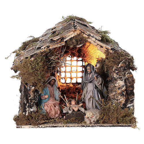 Szopka ze Świętą Rodziną, szopka neapolitańska z figurkami terakota 8cm, 15×20×18 cm.
