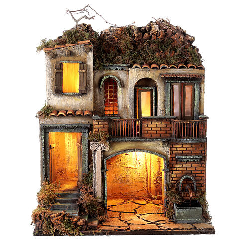 Wioska do szopki neapolitańskiej z balkonami, oświetlona, fontanna, 50x40x30, figurki 10-12 cm