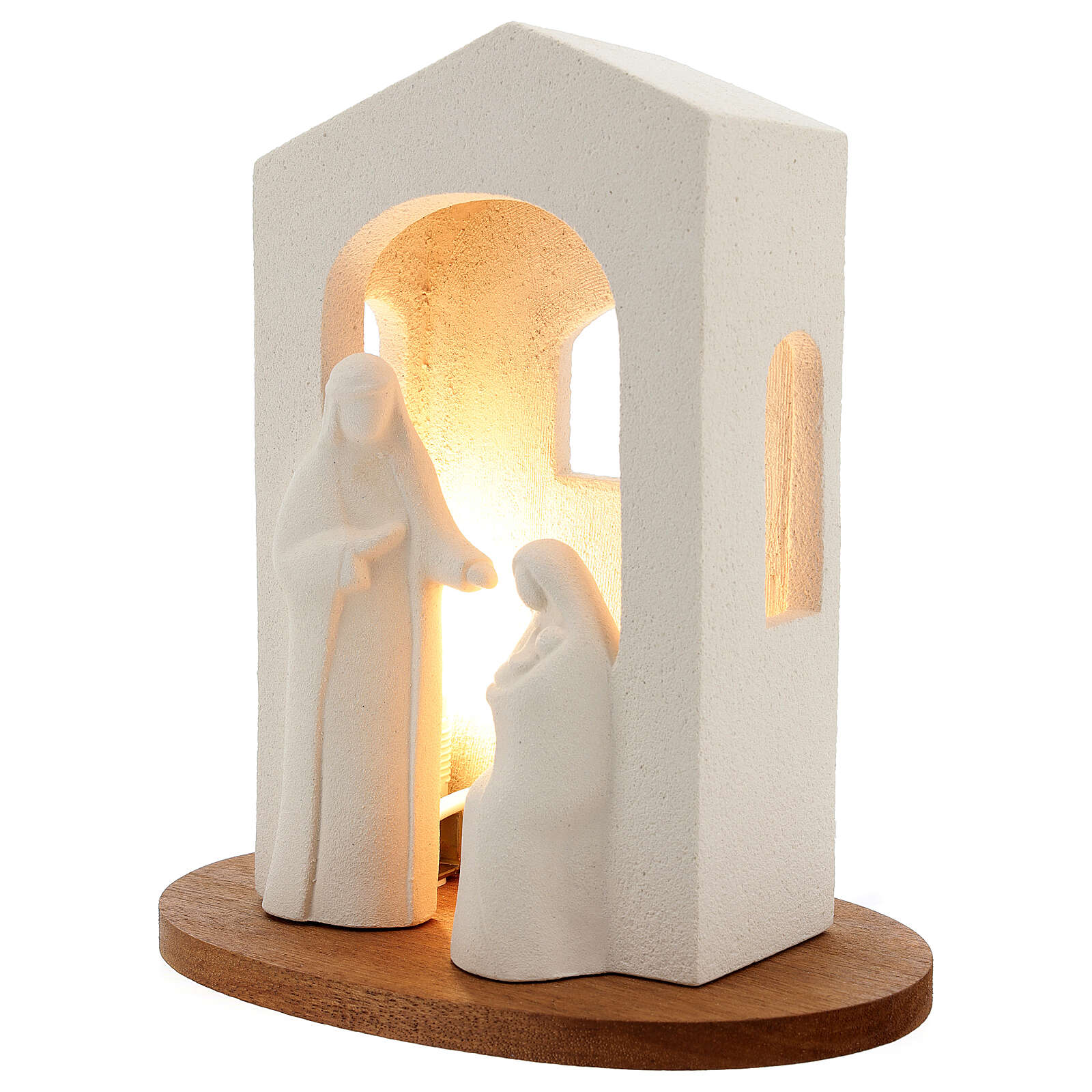 Ta stylizowana szopka została w całości zrealizowanych we Włoszech z białego szamotu i posiada oświetlenie zasilane 220V. Początkowo surowej glinie została nadana forma, a następnie poddano ją wypalaniu w temperaturze ponad 1000°C. Wykończenie oraz obróbka zostały ręcznie wykonane celem nadania figurce linii prostych, miłych oku i wymownych.