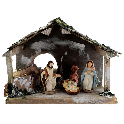 Stajenka drewniana z malowanymi figurkami z terakoty, Deruta, 12 cm, 30x35x20 cm.